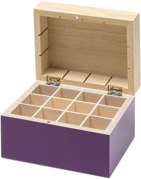 12 illóolaj, vagy illatkeverék tárolására alkalmas dekoratív fadoboz. Mindkét kiszerelésünk, a 10 ml-es és az 5 ml-es is elfér benne!